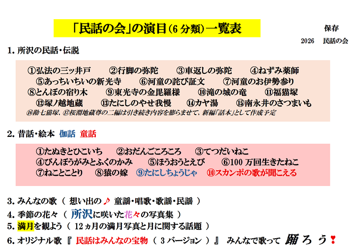 民話の会演目表(所沢の民話、昔話・伽話・絵本・童話、他)