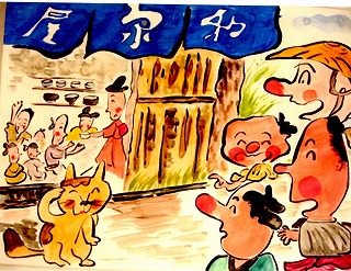 続いて、午後3時のお茶の時間に入所されている皆さん5、6人の前で「福猫塚」と紙芝居「貧乏神と福の神」そして新井さ