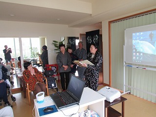 今日のプログラムは歌「楽しいひな祭り」「七つの子」「花」「砂山」の4曲。所沢の民話「弘法の三つ井戸」