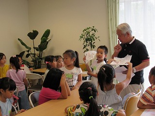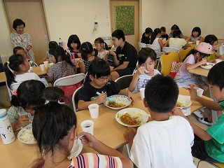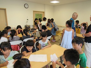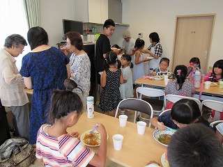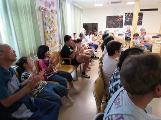 子供達と迎えの保護者、入所者、施設関係者の皆さんを含めて50人ほどのにぎやかさでした。子供たちにとっては、よき夏の思い出になったようでした。