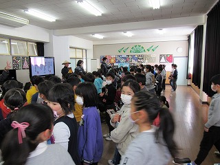 今年度は明峰小学校で学校訪問は3校目。段々と「語り」も調子が出てきました。
