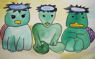 「河童の詫び証文」「河童のお伊勢参り」。2つは関連があります。最初の詫び証文を元につづきのお伊勢参りを会員が作文しました。その説明も解るように入れました。