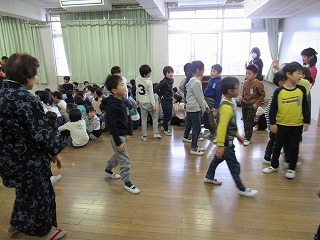 語り、「弘法の三ツ井戸」の前に音楽「民話はみんなの宝物」をかけて、合わせたダンスをするのですが、児童もそれなりについて踊ってくれました。