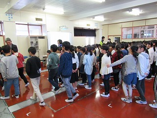 多目的室に集合した三年生(140名)は部屋いっぱいに並びました。「狭いかなあ」 生徒たちの入室と同時に、民話の会のオリジナルソング『民話はみんなの宝物』を流して、和みました。