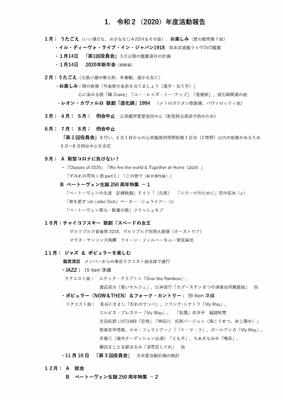 ・音楽を楽しむことを通じて、メンバー相互の 親睦と交流を図る。 ・オペラ鑑賞を主とし、各種クラシック音楽、ミュージカル、ジャズ、フォークソング、音楽関連映画などを、 8・9号学習室の大画面・大音量にて楽しむとともに、時には生演奏にも触れる機会を持つ。 |