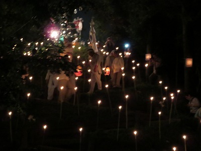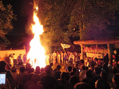 いよいよもって午後9時に麦藁の束の上に松明で火がつけられ、「お焚き上げ」が始まりました。先達は竹製の大幣束を