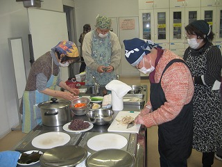 各グループは、おはぎ、けんちん汁を手際よく仕上げた。