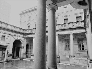 庭、旧地下金庫エリア、旧営業場、資料展示室)、新館(1階営業場)等の見学です。中庭にはこの建物が建築され