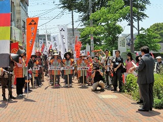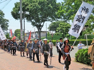 12時30分に、武者行列が二の丸跡に着陣しました。行列は、北条氏輝公、お比佐御前を守る形で、鉄砲隊、槍隊などで固め、北