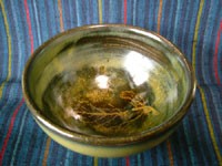 上のものでは有りませんが、炭化した木の葉が釉薬に滲み込んで、こんな感じで焼けます。