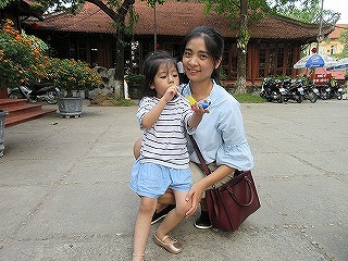 居間には昼食の準備ができていた。料理名はわからないが、ベトナムの家庭料理が床の上にならんでいる。まずは両親にごあいさつ。地酒もある。ついつい何杯 も飲んだ。酔っぱらって、ヒュエンの母に「ダンナさんのどこが気に入ったの?」と聞くと、即座に「あの人は身長が高いし、バレーボールをしていた」 (笑い)。初めての顔合わせであったが、すぐになごやかな雰囲気になった。 短いベトナム訪問だったが、なによりもヒュエンの両親にお会いできた。 何回も、お礼のことばで強く握手された。ベトナムの少数民族の少女が高校に行きたい、そのための 3年間のわずかな奨学金の援助だった。いまも、こんなに喜ばれ、しかも感謝されるとは思いもしなかった。 ソンタイに戻り、ヒュエンの家で休憩した。今回のひとり旅は、なによりも「ベトナムの娘と孫」に会えたことであった。 |