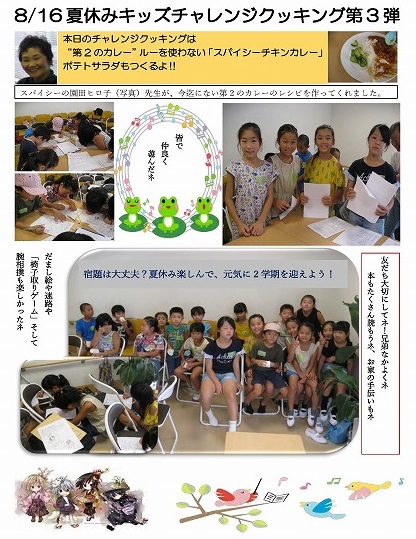昨年に続き、夏休み子ども食堂を8月(2日・9日・16日・23日)4回開催(民話の会公演を含む)。 ところざわ倶楽部の有志も参加して頂き、全会子供たちの元気な声と笑いで大盛況でした。 また、8月と云う事で、HPに掲載されている「戦争と平和」シリーズのなかの「へいわってすてきだね」と2018/8/6広島平和記念 式典「平和への誓い」を子供たち全員にプリントして、夏休みの課外学習として、子供たちに朗読してもらい、お父さん・お母さんと家で話題にしてみてと宿題。 また、市民大學受講生、ところざわ倶楽部の皆さんから食材のカンパを頂きました。お礼申し上げます。 主催:地域福祉サポーター松井地区・並木地区一同 後援:所沢市社会福祉協議会