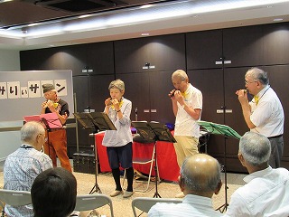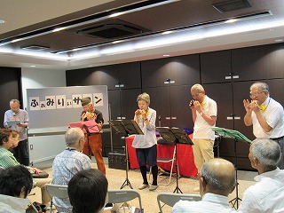 7月5日(木)10:00~12:00はオープニング記念なので、まず自分たちが出演出来るものを用意!渡辺さんがお弟子さんと落語2題、その後、 自分が主催する七夕ミニコンサート ~プロ並みのフルート、マンドリン、オカリナ演奏~ ○落語は水々亭めだか&きさらぎ亭きららのお相撲さん他 ○七夕ミニコンサートは名調子のビビル渡辺さんの司会、ダンディー岡本さんの「埴生の宿」、ゴルゴ中島さんの「夜空のトランペット」、エリザベス友子さんの「星の界」、 マイッケル原さんの「星に願いを」他合奏&みんなで歌おう
