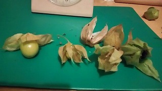 | 2016 08 -16 記 岡本 詔一郎 ガックリ ! 昨年、旅行で見かけた食用ほおずきの苗を持ち帰り、種を採り、春から全力で育て実が完熟し、3個黄色に実った。畑に 一緒にいた友ちゃんに「おい、見てくれ、やっと実った!」と千切って、苞を剥いたら中に実が無い! 唖然 頭が真っ白。残りを剥いたら、同じ、3個目も一緒。 相当植えているので、他の苗のまだ完熟していない青い綺麗な実をそっと生ったまま剥いて調べたら、同じように何も無 い。何だ、これは! どうなっているか信じられない。しかし、事実だから、どうしょうもない、