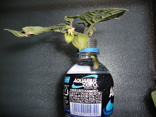 | 2016 07 -08 記 岡本 詔一郎 200本ほどの苗ももう少しになった!その一で「欲しい方は差し上げますと書いたが誰もまだ! 090-5766-6646へどうぞ、お待ちしています。 食用ほおずきの夢を追い続け、それに向かって頭はてんてこ舞い!宣伝と栽培両方同時並行、実に楽しい。今日はまた新 たな喜び!万歳と叫びたかった。その一で「ペットポトルに芽を挿し、芽が出て欲しい」と書いていた。あれから毎日観察 、ちょこっと芽らしいものが出た時は、ひょっとしたら本物かも!夜も・・・次の日見たら確かに伸びている、本物だ~ これで何時でも、計画的に増やせるめどが!しかし、花芽が付いているのを切るのはもったいない!もっと簡単に増やせ ないか?葉っぱなら幾らでもある。葉っぱからは出ないかな? やって見よう、即実行。挿し芽の観察と同時に葉っぱの方 も観察もしていた、昨夜、その葉っぱに根の兆候を発見。朝は未だ確証が得られなかったが、今見ると間違いない。大発見 !?しかし、葉っぱの場合は芽がどこから出るのかな!心配になって来た。