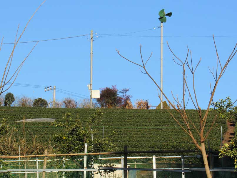 5月頃に、紫色の蝶形の花が総状に垂れ下がって咲く。今は裸木が数本あり、藤棚が寒々しい。 坂を上ると、左側の斜面に狭山茶畑が下りていく。縄が張られて入れないが、誰もいないので失礼して中へ入った。