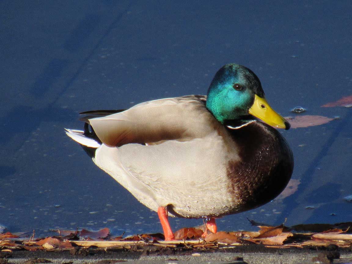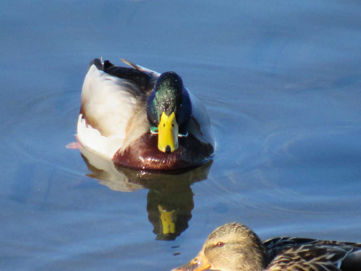 しばらく湖を眺めていると、マガモやカンムリカイツムリが三羽、五羽、十羽と取水塔の方向へゆっくりと泳いでいく、