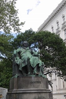 歌劇場の方に歩くとゲーテ像があります。ゲーテは詩人、小説家、劇作家、自然科学者、法律家、政治家です。恋多き天才ゲーテは72才で17歳の少女に恋をし、74才で求婚して断られます。「バカ云ってんじゃねーよ!」とチコちゃんに叱られるでしょうね、多分。( ̄ヘ ̄)「ギョエテとはオレのことかとゲーテ云い」 これは佐藤緑雨の作といわれていますが、ゲーテ像には確かに「ギョエテ」GOETHEと読めますね. (^_-)