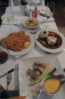 ▼ 楽友協会ホールの「モーツアルトの夕べ」は日本で知りましたが、開始時刻がウイーン空港到着時刻に近いのでチケットを買いませんでした。結局、ウイーン国 立歌劇場でRシュトラウスの歌劇「サロメ」を2時間鑑賞。やっぱり生の声とオーケストラの音は違います。終演後、近くの喫茶店で秘書とザッハトルテ、アプ フェルシュトゥーデルとウインナコーヒー(メランジェ)を。ホテルまでゆっくり歩いて20分。夜はテレビで「シェーンブルン宮殿庭園コンサート」をワイン を飲みながら2時間たのしみました。ウイーンフィルの演奏のあと、第2部はロシア民謡、中国の2胡、タンゴからプレスリーの「Can’t Help Falling In Love.」もあり、最後はやはりラデッキー行進曲でした。ウイーンらしい番組です。