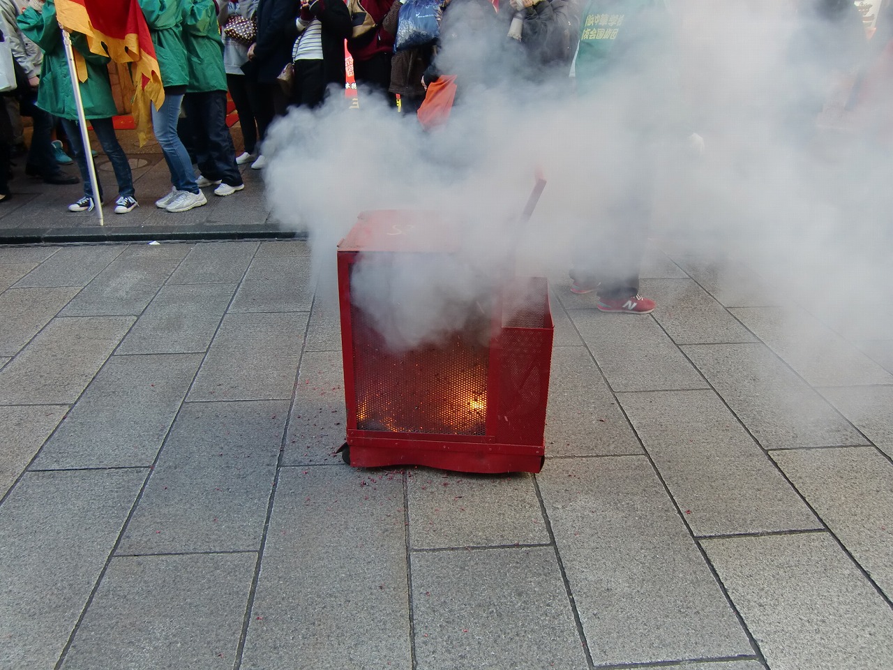 場中国のものと比べるとかなり小規模であり、右端の写真の通り 金属製のカゴの中で火をつけるので、迫力はなくやや物足
