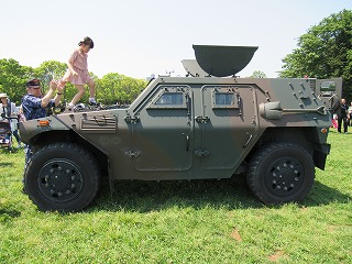すぐ隣に、自衛隊の「軽装甲機動車」「偵察用オートバイ」「救急車」が置かれていた。子供たちがボンネットに