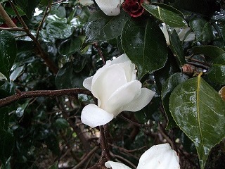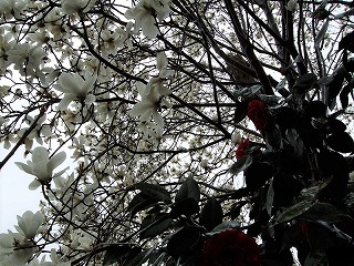 満開の白木蓮を見た。大ぶりの椿も美しかった。
