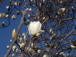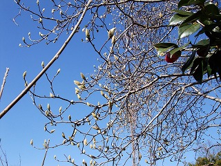 2月28日早朝に、所沢市小手指町で、大きな白木蓮の樹につぼみを見つけた。
