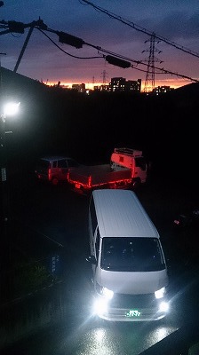 車が駐車場から出ようとしていたので 我が家の塀に以前当てたので、何の気なしに撮影 ところがバック灯の光が駐車しているトラックに反射!