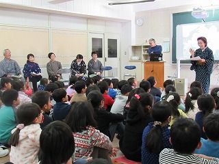 民話は「河童の詫び証文」と「弘法の三つ井戸」です。パワーポイントの画面を見たり、語り手を見たりして熱心に耳を傾けてく