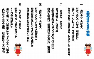 テンションを上げるために、歌からはじまりました。皆で歌えるように、模造紙に歌詞を書いて貼付しました。歌