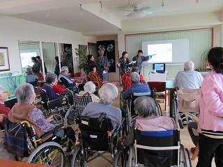 出来ました。施設内カフェ「花一輪」に車いすや介護士さんに手を引かれて15人ほど集まってくださいました。