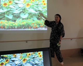 今回の構成は「みんなの歌」、民話「とんぼの宿り木」「南永井のさつまいも」、「夏の花々」の画面を壁に大きく映しだしながら楽しみました。子供たちは静かに真剣に視聴してくれました。