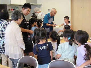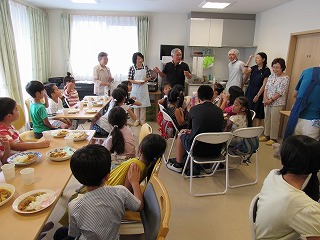 子供達と迎えの保護者、入所者、施設関係者の皆さんを含めて50人ほどのにぎやかさでした。子供たちにとっては、よき夏の思い出になったようでした。