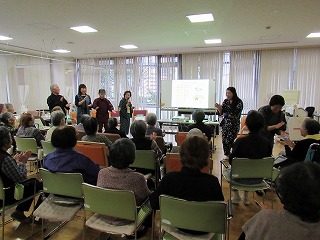 会場は全員で体操をしているところであった。途中、お茶の時間があり水分補給も忘れない。そうそう、民話のライブ中も途中お茶の時間があった。健康に留意されているのですね。我々もおいしいお茶をいただきました。