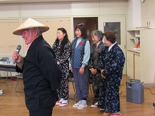「絵で見る昔の所沢の風景」の場面でも、説明者のアドリブの質問によく答えてくれました。説明者が本物の道具を持ってきて見せて説明をしました。(せいろざる、ひしゃく、etc )