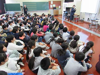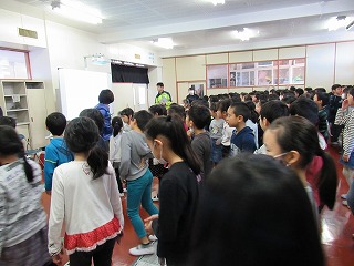 多目的室に集合した三年生(140名)は部屋いっぱいに並びました。「狭いかなあ」 生徒たちの入室と同時に、民話の会のオリジナルソング『民話はみんなの宝物』を流して、和みました。