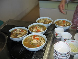 各グループは、おはぎ、けんちん汁を手際よく仕上げた。