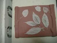 作陶した皿を乾燥し、素焼きしたものに釉を掛け、椋の葉を灰化したものです。この後、本焼きし、木の葉が焼き付けられます。