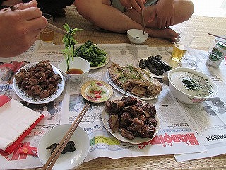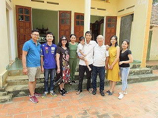 居間には昼食の準備ができていた。料理名はわからないが、ベトナムの家庭料理が床の上にならんでいる。まずは両親にごあいさつ。地酒もある。ついつい何杯 も飲んだ。酔っぱらって、ヒュエンの母に「ダンナさんのどこが気に入ったの?」と聞くと、即座に「あの人は身長が高いし、バレーボールをしていた」 (笑い)。初めての顔合わせであったが、すぐになごやかな雰囲気になった。 短いベトナム訪問だったが、なによりもヒュエンの両親にお会いできた。 何回も、お礼のことばで強く握手された。ベトナムの少数民族の少女が高校に行きたい、そのための 3年間のわずかな奨学金の援助だった。いまも、こんなに喜ばれ、しかも感謝されるとは思いもしなかった。 ソンタイに戻り、ヒュエンの家で休憩した。今回のひとり旅は、なによりも「ベトナムの娘と孫」に会えたことであった。 |