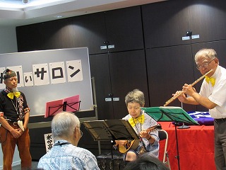 7月5日(木)10:00~12:00はオープニング記念なので、まず自分たちが出演出来るものを用意!渡辺さんがお弟子さんと落語2題、その後、 自分が主催する七夕ミニコンサート ~プロ並みのフルート、マンドリン、オカリナ演奏~ ○落語は水々亭めだか&きさらぎ亭きららのお相撲さん他 ○七夕ミニコンサートは名調子のビビル渡辺さんの司会、ダンディー岡本さんの「埴生の宿」、ゴルゴ中島さんの「夜空のトランペット」、エリザベス友子さんの「星の界」、 マイッケル原さんの「星に願いを」他合奏&みんなで歌おう