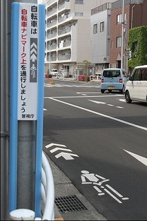 所沢市駅前から南方向に出かけてみました。 柳瀬川を越えるとそこは東京都です。埼玉県警から警視庁の管轄下に入り、東村山市を南北に 貫いている「府中街道」を進むとすぐ、車道の左寄りに車の運転手からはっきり見える道路標 示に気づきました。それは「自転車ナビマーク」(写真・左)と命名されていて、「お、これ はお初だ、自転車に優しくなったかな」と自転車を止めて1枚パチリ。 西武多摩湖線の八坂駅から左折して、多摩湖から武蔵境までつづく導水管の上に整備された「多 摩湖自転車道」(注意・もちろん歩行者優先です)を小平駅・花小金井駅近くを過ぎ、都立小金井 公園までのルートをお勧めしたいです。春の桜や新緑などが素晴らしく、意外と近くですので、一 年中どうぞ。おにぎり持参で、ゆっくり所沢から往復できます。