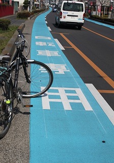 所沢市から北方向に行くと狭山市です。 3か月ごとの定期健康診断のため約 40分先の病院まで 「運動のため」と思って自転車で通院しています。数年前から、よく目立つブルーカラーの「自 転車専用」(写真・右)のレーンがあります。東京都内より車道もレーンも幅が広いので「安心 」して走ることができますし、爽快な気分になれます。 少し足を伸ばせば、入間川にすぐ着きます。橋を渡った左岸に「川越狭山自転車道」がありま す。川の流れに沿っているので勾配がほとんどなく、遠くが見渡せて、もちろんウオーキングや ジョギングを楽しんでいる方も多く、サイクリストとしての良識を持っていれば、楽しい時間を 過ごすことができます。その先は荒川から南方向は東京湾方面へ、北方向は川越市・川島町・吉 見町などと自転車の道はどこまでも続いています。(体力的な限界・気候などを考慮の上、「慎 重な計画」が絶対必要です。) ◆ ◆ |