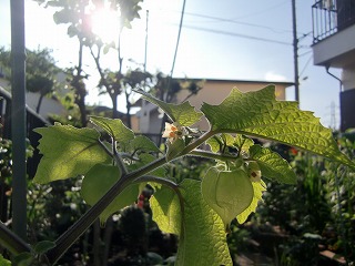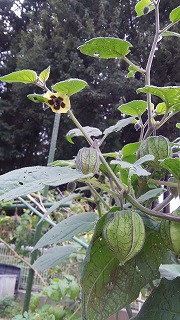 | 2016 6 -24 記 岡本 詔一郎 昨年の6月ごろ詩吟の旅行中、道の駅湯沢村苗売り場で、食用の字に目が止まった! 食用ほおずきの苗が一株売られていた。初めて目にしたので早速買った。旅の途中なので持ち運びが大変だった。 早速、畑に植え観察するが何時まで経っても大きくなるだけで花も実も生らないので肥料を張り掛けた。そのた めか大きくなり過ぎ枝が折れたり、支柱を添えたり四苦八苦!自分の背丈以上に大きく枝を張り見事に! ところが8月末に見たこともない花らしきものがポツリ!それから次々に実も付け、100個以上も生り続けた。 可愛い花で実も小さなものがだんだん大きくなり、その薄緑が何とも言えない!
