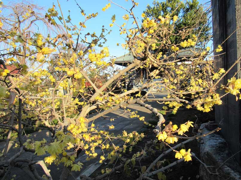 現在8時過ぎ、蝋梅を見に行こうと思い立ち、北野院全徳寺へ向った。 正月三が日の賑わいは何処へやら、私一人である。黄色い小さな花が咲き誇っていた。 暖冬のため開花が早いらしい。
