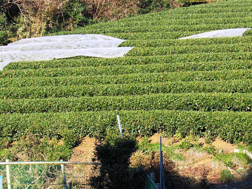 5月頃に、紫色の蝶形の花が総状に垂れ下がって咲く。今は裸木が数本あり、藤棚が寒々しい。 坂を上ると、左側の斜面に狭山茶畑が下りていく。縄が張られて入れないが、誰もいないので失礼して中へ入った。