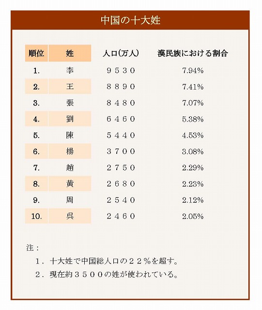中国人の十大姓は、以下の表を参照下さい。