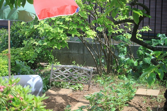 の狭い庭に、昔、子どもが小さい頃に高麗川などの河原に出かけた時に使った「ビーチ パラソル」を立てました。その下に椅子を置いて、新聞を読んだり庭仕