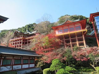 、神楽殿、本殿などの豪華さから「鎮西日光」といわれます。117段、18mのご本殿にのぼって参拝します。京都清水寺の舞台より高いとか。バスセンター