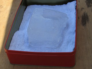 氷の塊が「ドン」と置かれるのかと思ったら、約40センチ幅の缶の中に敷かれた白い布の上に、約20センチ幅の
