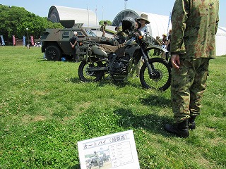 すぐ隣に、自衛隊の「軽装甲機動車」「偵察用オートバイ」「救急車」が置かれていた。子供たちがボンネットに